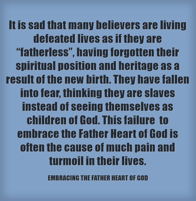 我们都需要经历重生后,方能完全经历上帝为父的心。然而可悲的是,现金许多基督徒仍然活在被打败的生活中,好像失去父亲的孤儿一样。他们忘记了自己属灵的身份,还有重生后所得的属灵产业。他们陷入恐惧中,认为自己是奴仆,而不是上帝的孩子。这样无法珍惜上帝为父的心,就是经常导致他们的生命面对许多痛苦和风暴的原因。