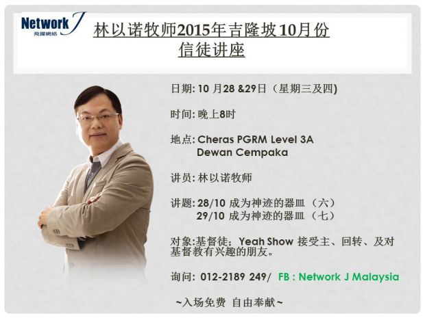 是否参与了近期由Network J International Berhad 所举办的 Yeah Show 2015 呢?那么,就千万别错过今天和明天将会举办的林以诺牧师10月份信徒培灵讲座了。
