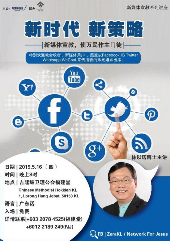 继3月25日举行的『新时代 新视野 新媒体』专题讲座,林以诺博士于5月16日 再度来马举行新媒体宣教系列讲座之『新媒体 新策略』。