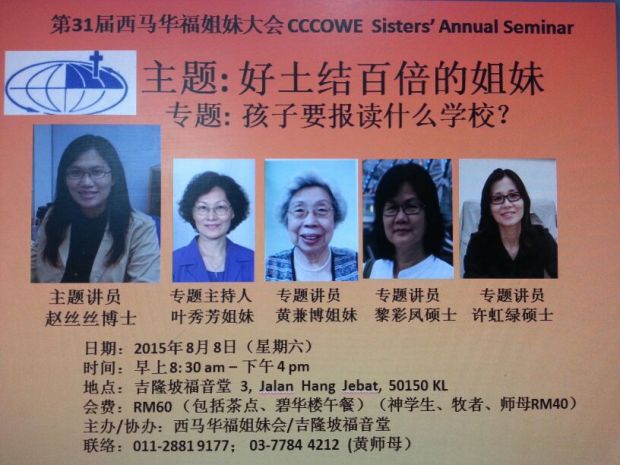 西马华福姐妹会将于2015年8月8日(星期六),早上8点30分至下午4点,在吉隆坡福音堂举办第31届西马华福姐妹大会。今年主题为《好土结百倍的姐妹》。